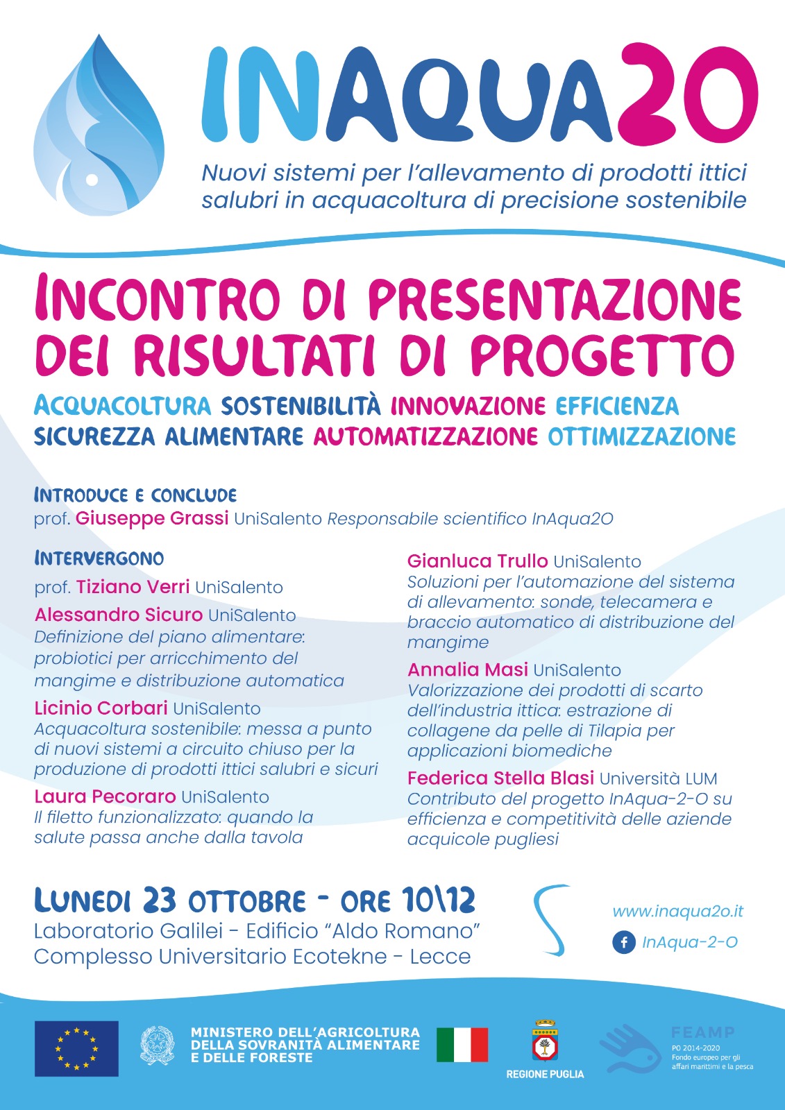 | DOWNLOAD | PUGLIA | INACQUA2 – MESSA A PUNTO DI NUOVI SISTEMI A CIRCUITO CHIUSO PER LA PRODUZIONE DI PRODOTTI ITTICI SALUBRI E SICURI – https://www.inaqua2o.it/ | FEAMP 2014-2020 | PRIORITÀ 2: “Favorire un’acquacoltura sostenibile sotto il profilo ambientale, efficiente in termini di risorse, competitiva e basata sulle conoscenze” MISURA ART. 2.47.1 – Innovazione – Sviluppo di conoscenze nelle imprese acquicole per ridurre l’impatto sull’ambiente MISURA ART. 2.47.3 – Innovazione – Sviluppo di conoscenze nelle imprese acquicole che favoriscono un uso Sostenibile delle risorse in acquacoltura | UNIVERSITA DEL SALENTO |